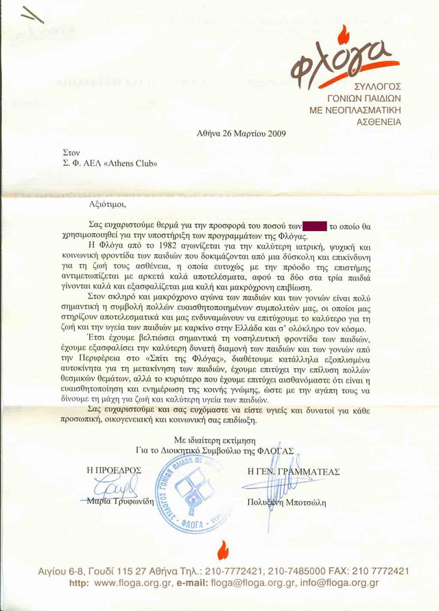 Στις 26 Μαρτίου 2009, μέλη του Σ.Φ. ΑΕΛ «ATHENS CLUB», πραγματοποίησαν επίσκεψη στις εγκαταστάσεις της ΦΛΟΓΑΣ (Αιγίου 6-8, Γουδί Αθήνας) και συναντήθηκαν με την πρόεδρο του Συλλόγου κα. Μαρία Τρυφωνίδου, η οποία και τους ξενάγησε στον ξενώνα όπου φιλοξενούνται τα παιδιά και οι οικογένειες τους. Κατά την διάρκεια της συνάντησης έγινε παρουσίαση της διαδρομής της ΦΛΟΓΑΣ από την ίδρυσή της το 1982 μέχρι σήμερα και παρουσιάστηκαν οι πολύτιμες υπηρεσίες που παρέχονται τόσο προς τα παιδιά που δίνουν την μάχη με την ασθένεια, όσο και προς τα μέλη των οικογενειών τους. Επίσης, μαζί με το συγκεντρωθέν χρηματικό ποσό, παραδόθηκε και υλικό των δύο συνδέσμων προς τα παιδιά που φιλοξενούνται στον ξενώνα.